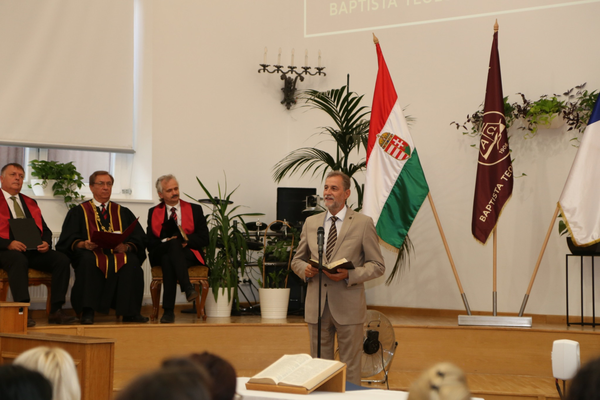 Serafin József imádságát követően a bibliai tanítással kiegészült rektori beszéd hangzott el, amelyben Mészáros Kálmán a 2Timóteus 3,1-12 („Azt pedig tudd meg, hogy az utolsó napokban nehéz idők jönnek…”) alapján rámutatott, hogy ma az utolsó napok világias szemléletében élnek az emberek és mi ne legyünk ezek követői. Valakit bizonyosan ránk bízott az Úr, legyünk áldássá mások életében testvérként, szülőként, munkatársként. Majd elődeinkre emlékeztünk rövid egyháztörténeti kitekintéssel, ezután pedig a jelen számai következtek a Teológia vonatkozásában: az elmúlt évben 74 fő vette át diplomáját, 150-en iratkoztak be az idei tanévre, köztük vannak hallgatók 8 másik felekezetből is, illetve nagy öröm, hogy lelkipásztori képzésben 35 hallgató készül a gyülekezeti szolgálatra.