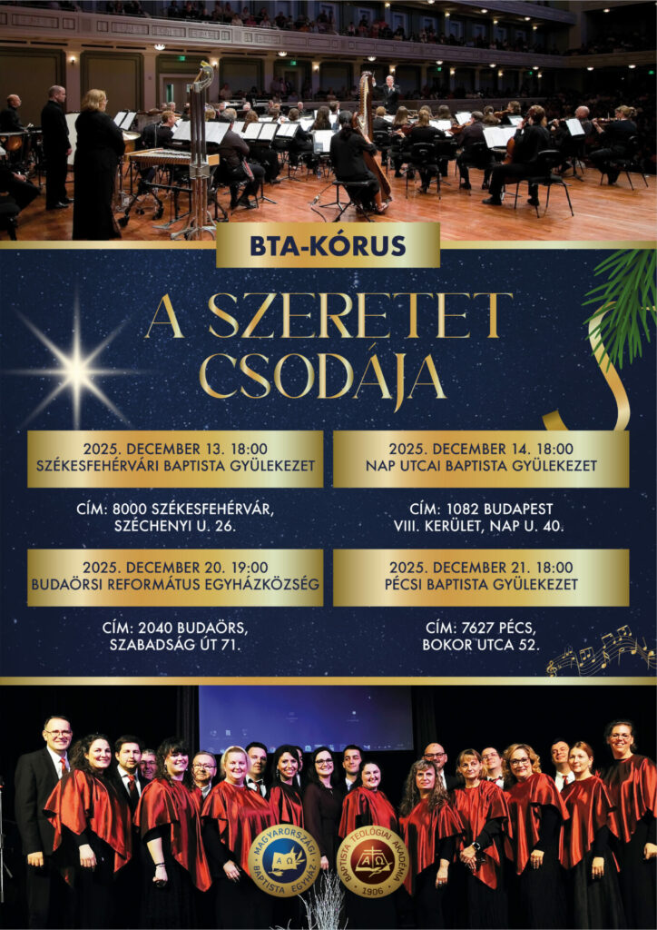 A BTA-Kórus idén is elviszi az embereknek Isten igéjét a Szeretet csodája c. karácsonyi evangélizációs koncertjeivel. Az adventi időszakban lehetőségünk nyílik ismerősöket, barátokat, érdeklődőket meghívni erre az ingyenesen látogatható színvonalas eseményre.