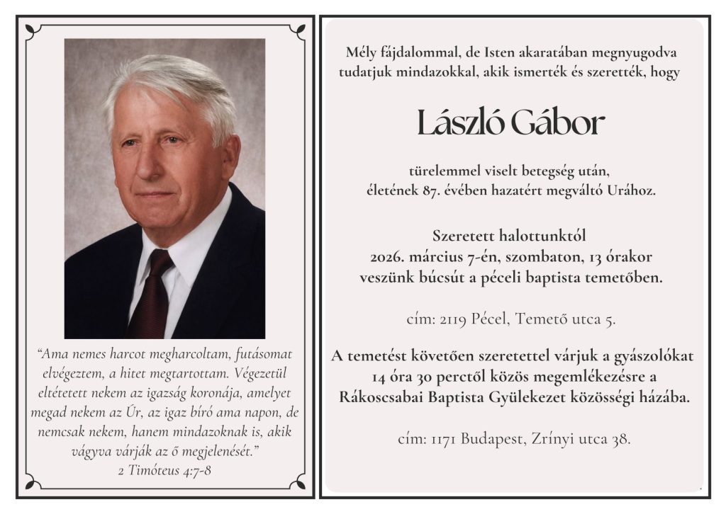 Mély fájdalommal, de Isten akaratában megnyugodva tudatjuk, hogy László Gábor nyugalmazott lelkipásztor életének 87. évében hazatért megváltó Urához.
